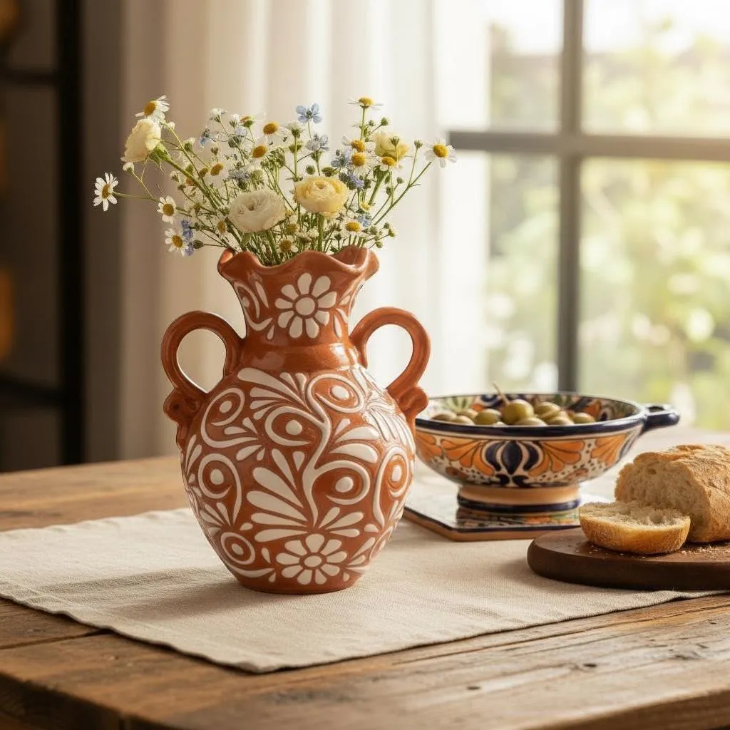 Jarrón de Talavera mexicana pintado a mano con borde festoneado, marrón claro y blanco, diseño floral exclusivo
