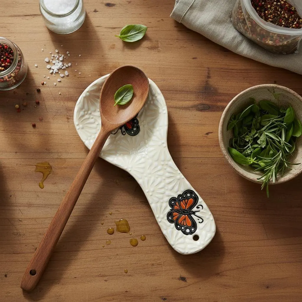 Hand Painted Mexican Talavera Spoon Rest, Ivory & White Cielito Lindo, Monarch Butterfly